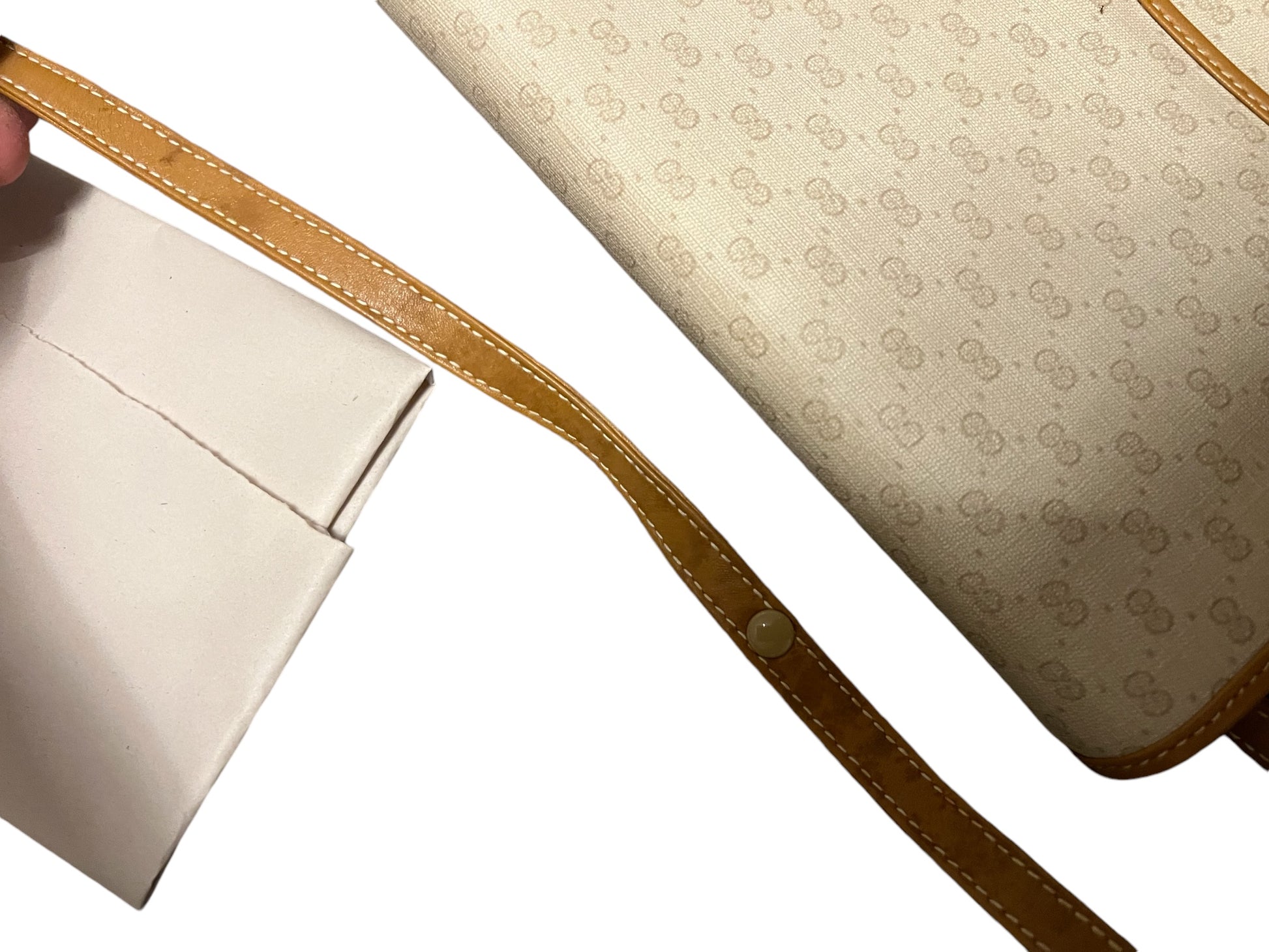 Condition - 8.5/10 immaculate condition and brand new looking. pristine throughout although a few very minor stains on the strap. All zips/straps/buttons in fantastic working order. This is an amazing piece with a phenomenal colour-way being beige with leather accents.