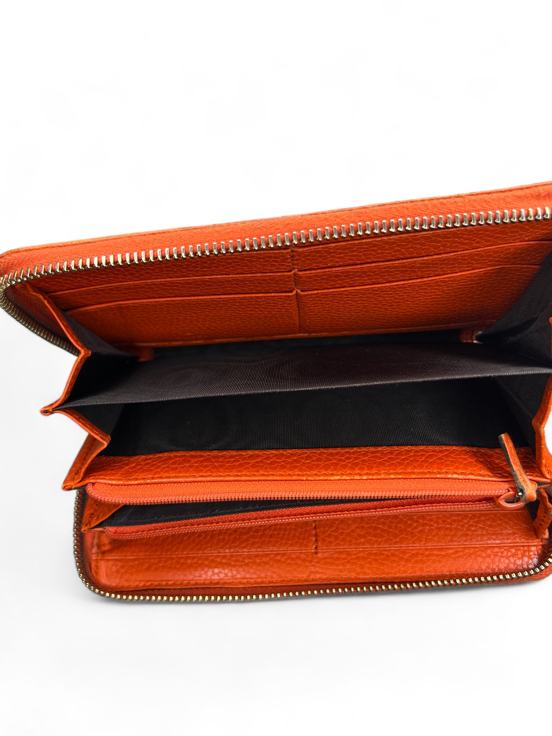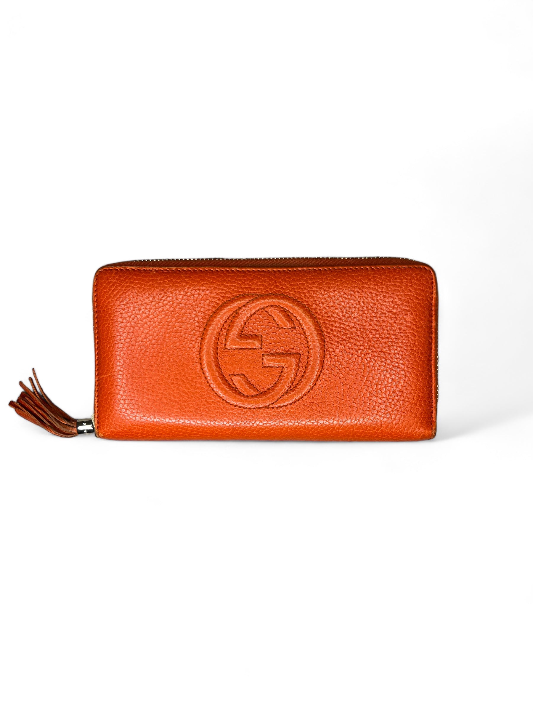 Update your wardrobe with the luxurious Gucci Soho Zip Purse in a vibrant orange color. The perfect companion for your everyday essentials, this purse boasts an 8.5/10 condition and comes with its box included. Elevate your style and make a statement with this must-have accessory.