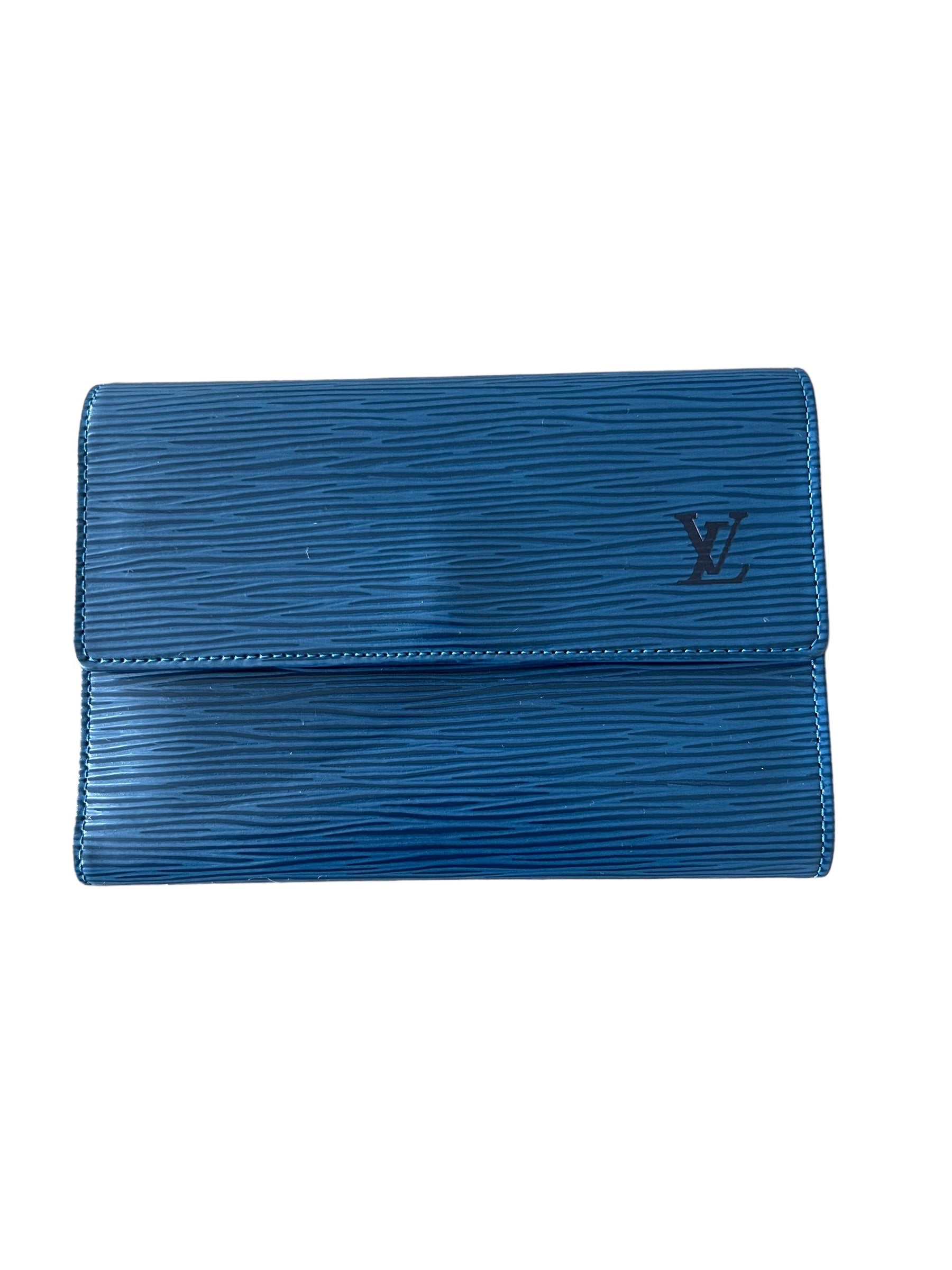 "The Louis Vuitton EPI Porte Tresol features luxurious epi leather in a stunning light blue color. Despite a minor tear on the inside, this flaw has no impact on the product's functionality. Elevate your style with this timeless and elegant accessory."